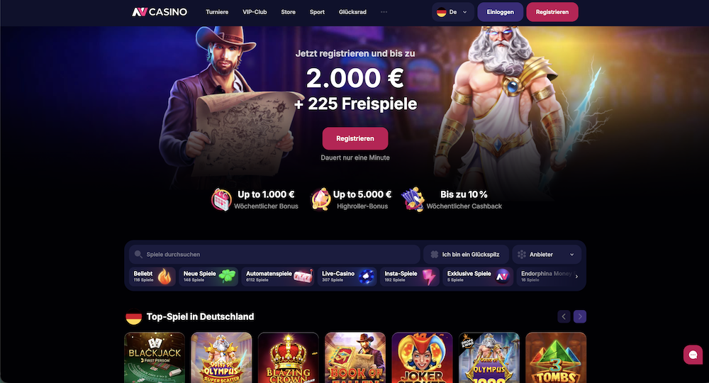 NV Casino ist ein lizenziertes Online-Casino mit über 6900+ Spielen, schnellen Auszahlungen in 24 Stunden und einem Willkommensbonus bis zu 2.000€. Die Registrierung dauert nur 1 Minute – danach hast du Zugriff auf Slots, Live Casino und Tischspiele von Top-Providern. Ist NV Casino seriös? Ja, das Casino ist vollständig lizenziert und nutzt SSL-Verschlüsselung. Die NV Casino App ermöglicht mobiles Spielen mit NV App Login per Fingerabdruck. Zahlungen erfolgen per Kreditkarte, E-Wallet oder Krypto. Aktuelle Aktionscodes und Bonus Angebote findest du auf der Bonus-Seite – perfekt für Neukunden und Bestandskunden. Neue Codes ab 19.02.2026: FREESPINS50 (50 Free Spins ohne Einzahlung).